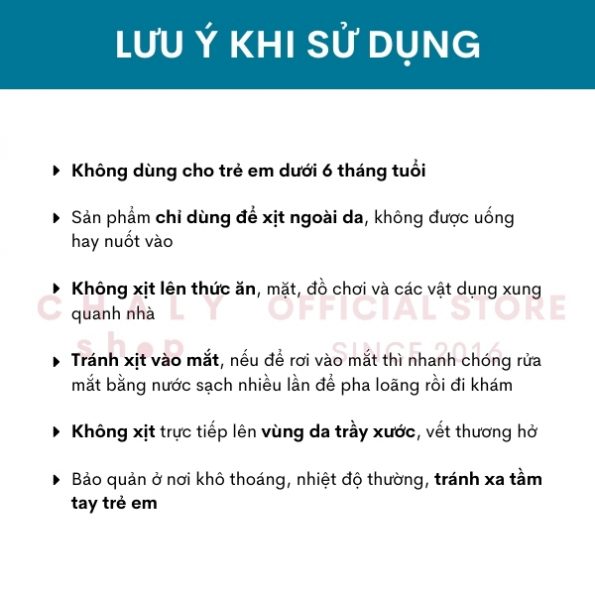 – Sản phẩm dùng để xịt ngoài da, không được uống nuốt vào. Không xịt lên thức ăn, mặt, đồ chơi và các vật dụng xung quanh nhà