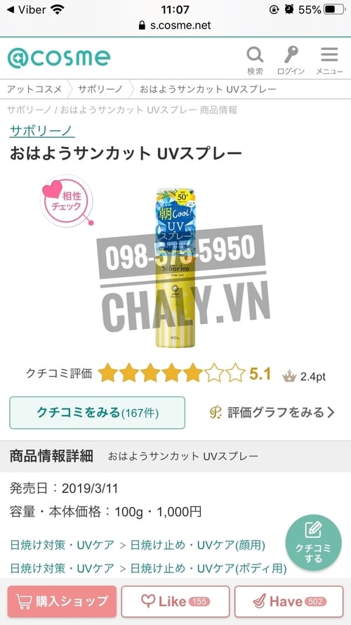 – Là xịt chống nắng Nhật review cao. Điểm đánh giá 5.1 trên chuyên trang Cosme Japan uy tín với hàng trăm review từ người dùng thực ở Nhật