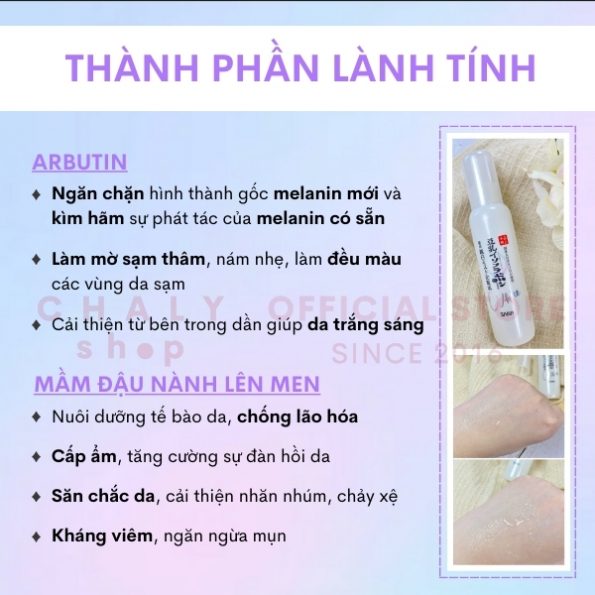 Xong rồi thêm cả các tiêu chí lành tính như không hương liệu, không dầu khoáng, công thức dịu nhẹ cho da mụn, hàm lượng arbutin cao, có tác dụng ngừa mụn ngừa viêm .. nghe đã thấy thích rồi