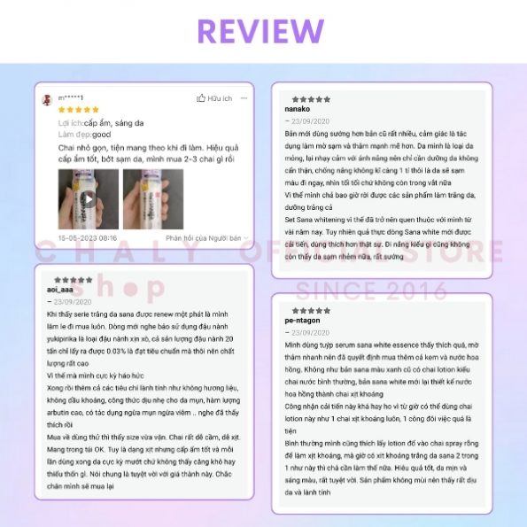 “Mình dùng tuýp serum sana white essence thấy thích quá, mờ thâm nhanh nên đã quyết định mua thêm cả kem và nước hoa hồng