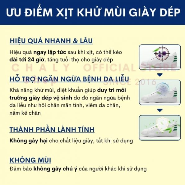 – Nếu cần khử mùi hôi chân, vui lòng tham khảo các sản phẩm xịt khử mùi hôi chân được Chaly giới thiệu ở phần bên dưới nhé