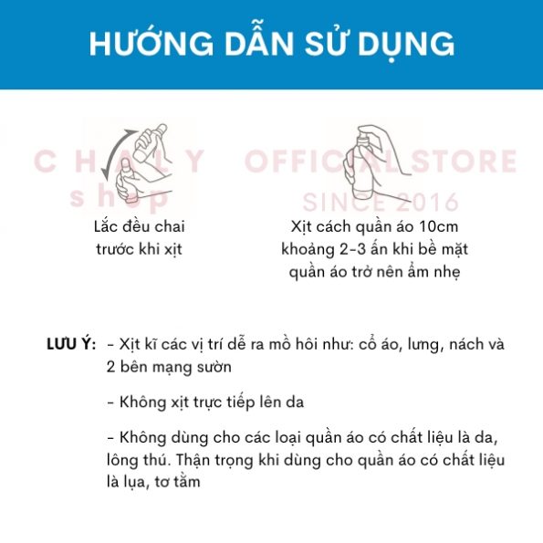 – Giữ bình xịt cách quần áo 10cm rồi ấn nút xịt cho đến khi bề mặt quần áo trở nên ẩm nhẹ (khoảng 2-3 lần xịt tại một vị trí)